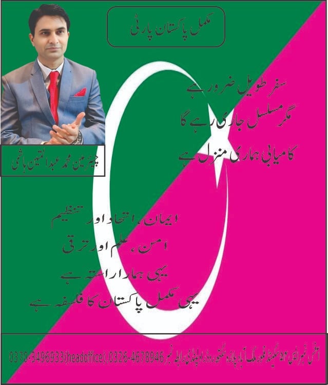 چیئرمین نے یہ بھی کہا کہ مکمل پاکستان پارٹی انتخابی عمل میں بھی تمام سیاسی جماعتوں کے ساتھ مل کر چلنا چاہتی ہے۔ یہ تعاون اقتدار کے حصول کے لیے نہیں بلکہ پاکستان کے روشن، محفوظ اور ترقی یافتہ مستقبل کے لیے ہے۔ ان کا کہنا تھا کہ اگر نیت صاف ہو تو انتخابی عمل مقابلہ نہیں بلکہ قومی ذمہ داری بن جاتا ہے۔